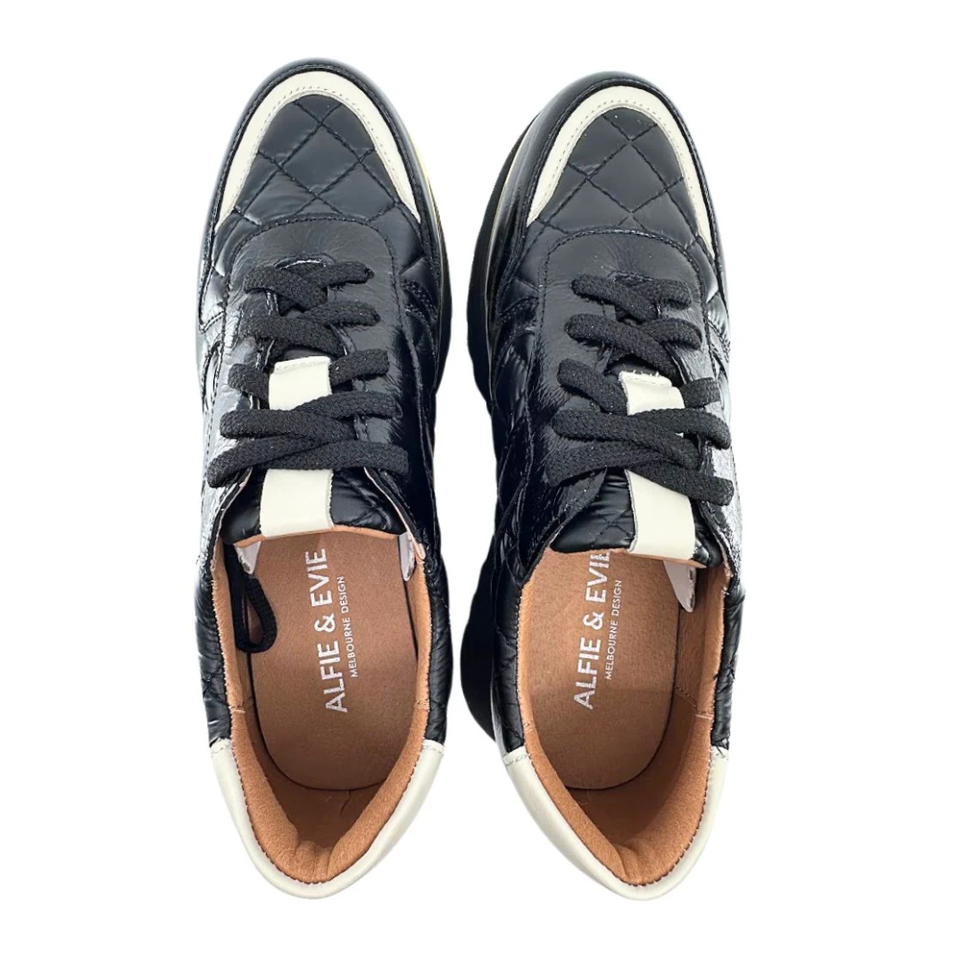 HELENA by ALFIE & EVIE is a statement fashion sneaker, showcasing a soft, Turkish leather upper with quilted nylon embellishments, gold rand detailing and a lightweight, platform sole. Offering the perfect blend of casual/dress hybrid style, HELENA will take you from dawn ’til dusk, in style and ultimate comfort!