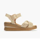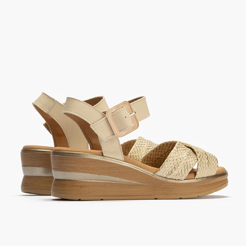 Elevate your summer footwear collection with this elegant Beige-Gold sandal, featuring two crossed stripes adorned with shimmering gold scales on the front upper for a touch of glamour. At the instep, a beige strap with an adjustable bone buckle and an elastic insert ensures a perfect, comfortable fit tailored to every foot.