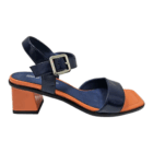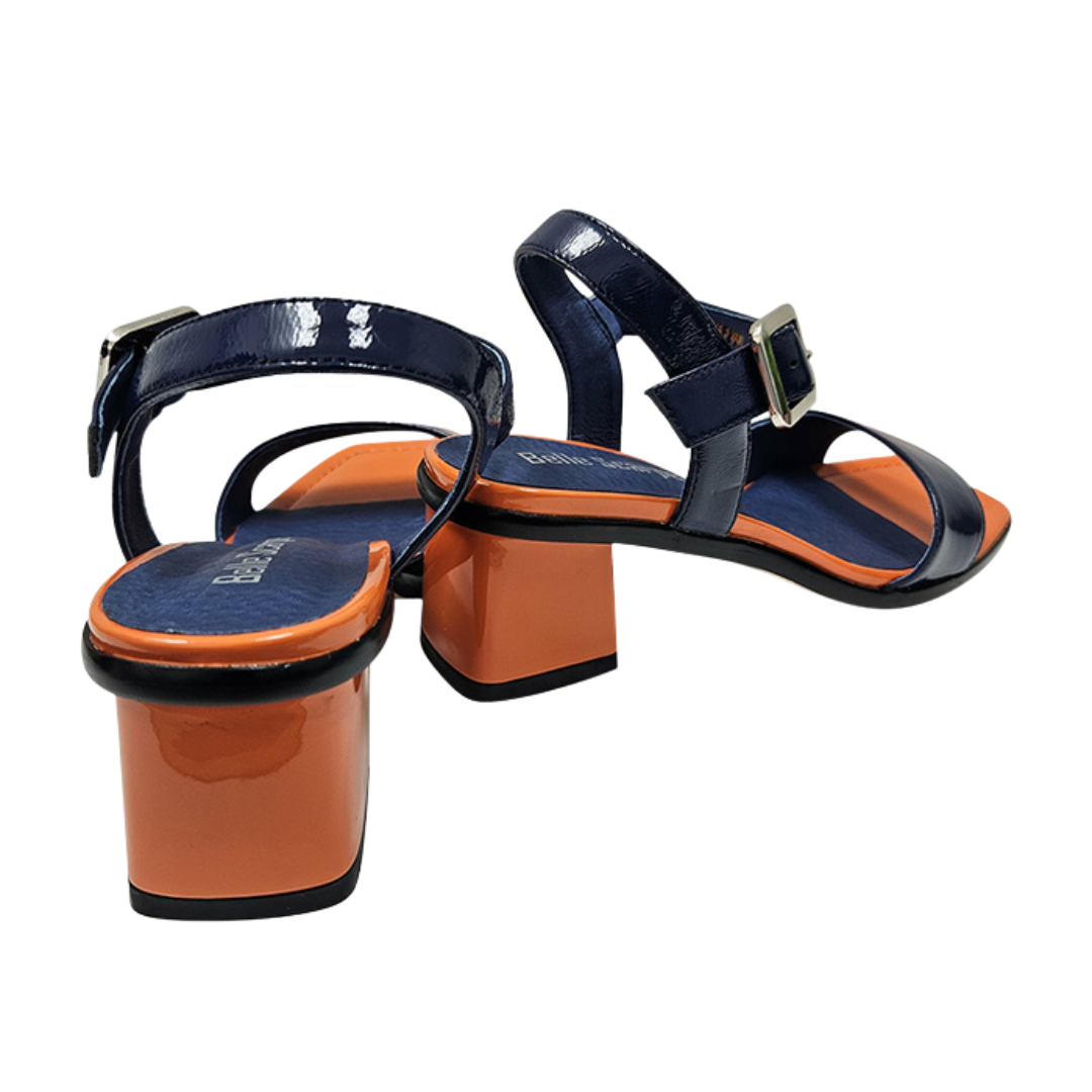 • Classic open-toe sandal featuring glossy navy patent leather base with a bold orange footbed and heel, creating a fresh, summery contrast