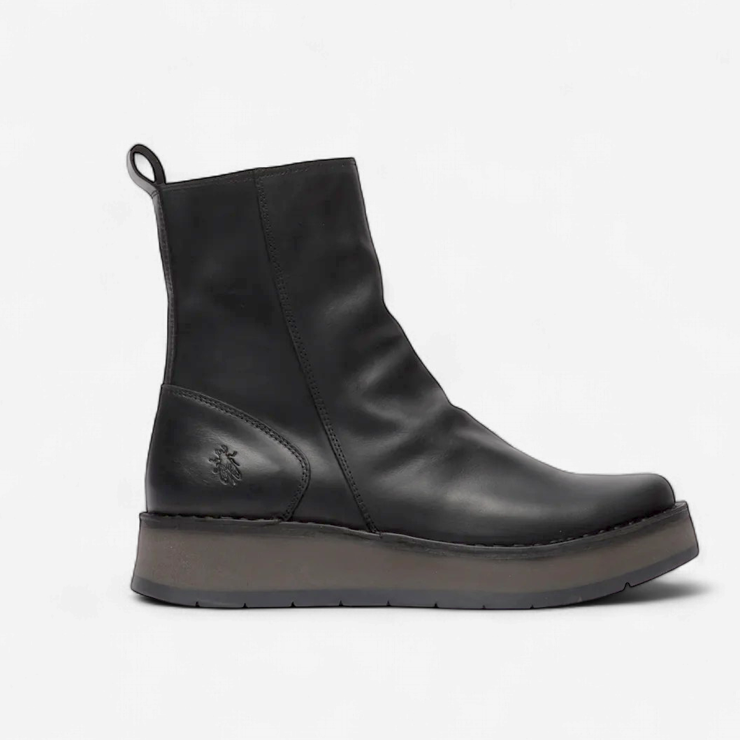 The Fly London Reno boot combines understated style with everyday practicality. Crafted with a smooth black leather outer, this ankle boot offers a timeless look that pairs effortlessly with any wardrobe.