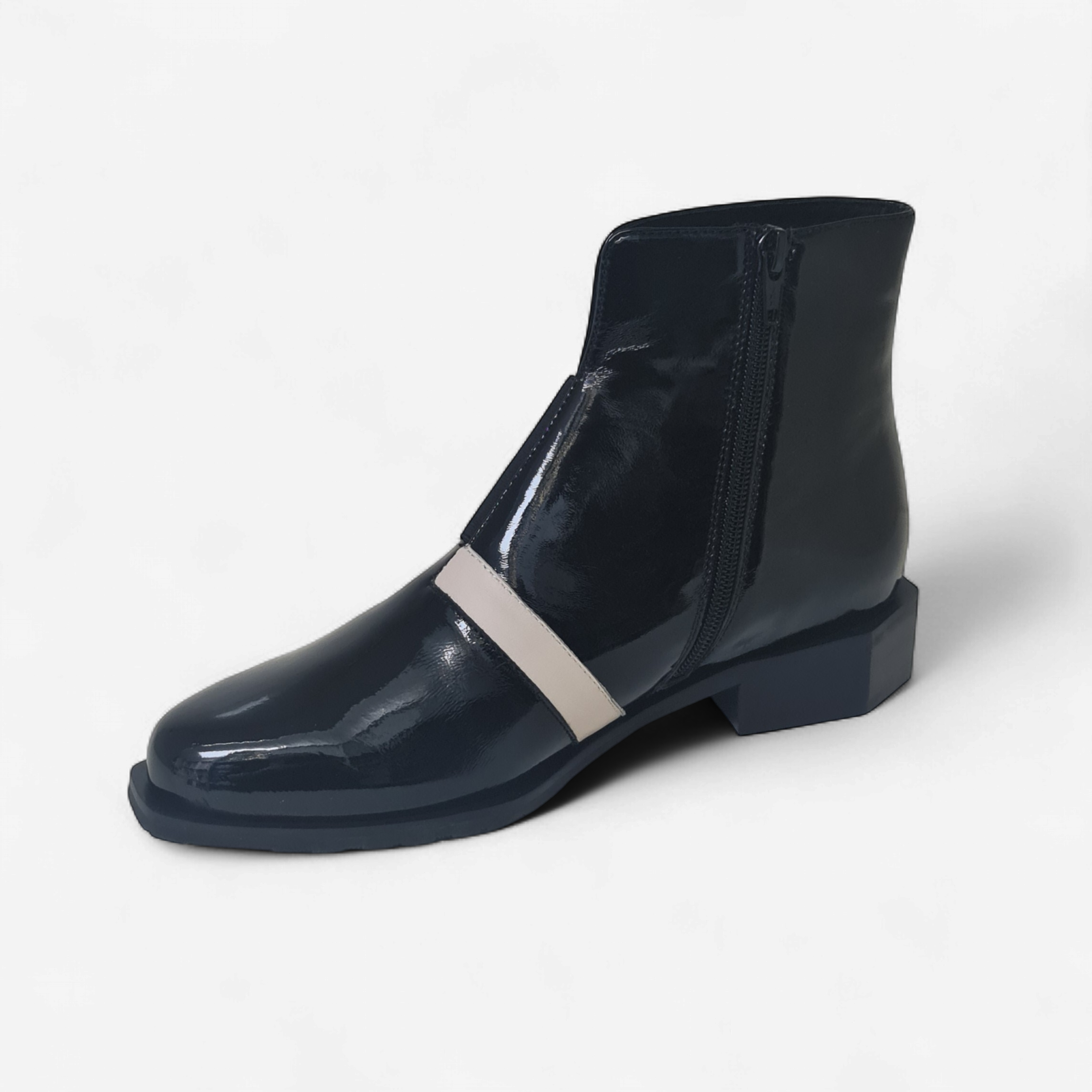 The Rollo Boot by Belle Scarpe is a striking blend of elegance and modern design. Crafted in glossy black patent leather, this statement ankle boot features a unique heel and a distinctive cream feature strip that adds a sophisticated contrast. With its sleek finish and bold detailing, the Rollo Boot is perfect for elevating both day and evening looks.